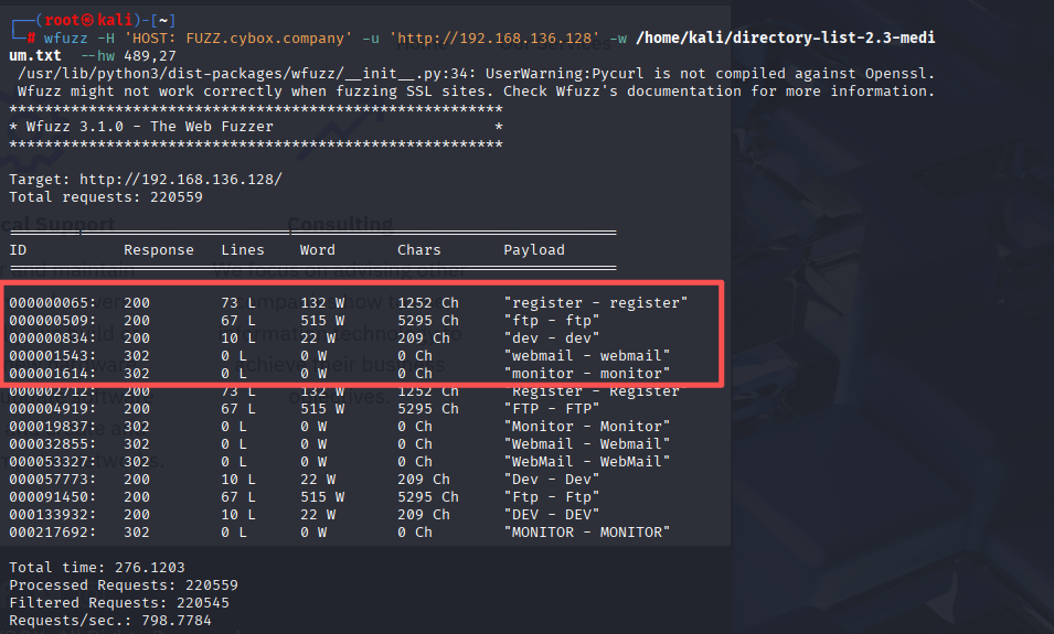 wfuzz -H 'HOST: FUZZ.cybox.company' -u 'http://192.168.136.128' -w /home/kali/directory-list-2.3-medium.txt --hw 489,27等待结果报告