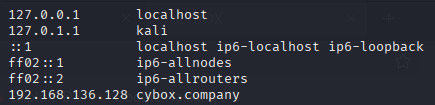 接下来我们编辑 /etc/hosts 文件,在其中添加 192.168.136.128 cybox.company 解析域名至其IP地址