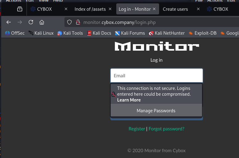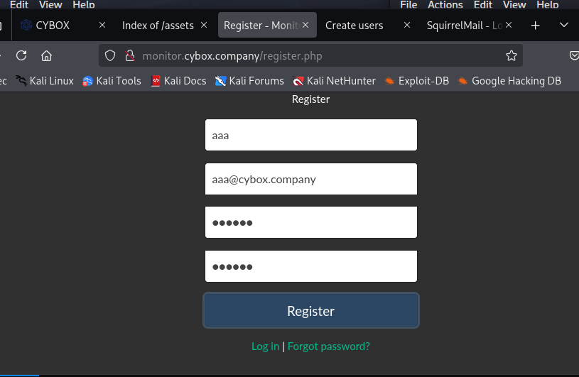 在 monitor.cybox.company 站点上注册一个新用户aaa,点击网站中的 Register