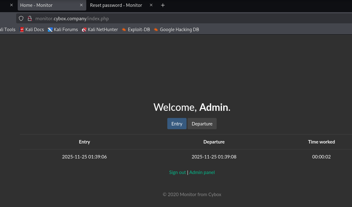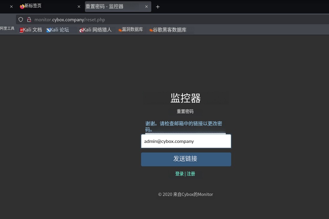 我们切换至monitor.cybox.company 点击 Forgot password? 忘记密码,输入admin@cybox.company