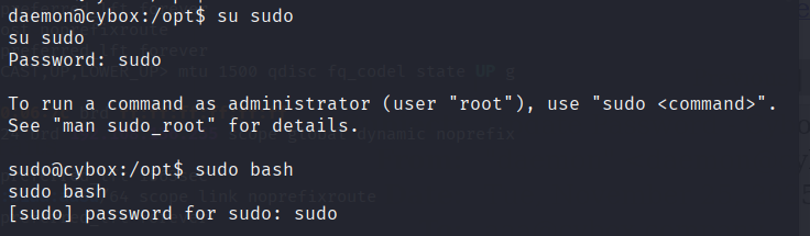 输入 su sudo 切换至 sudo 用户,随后使用 sudo 命令进行提权,后面跟什么命令无所谓,重要的是用 sudo 命令让系统向我们索要sudo 用户的密码