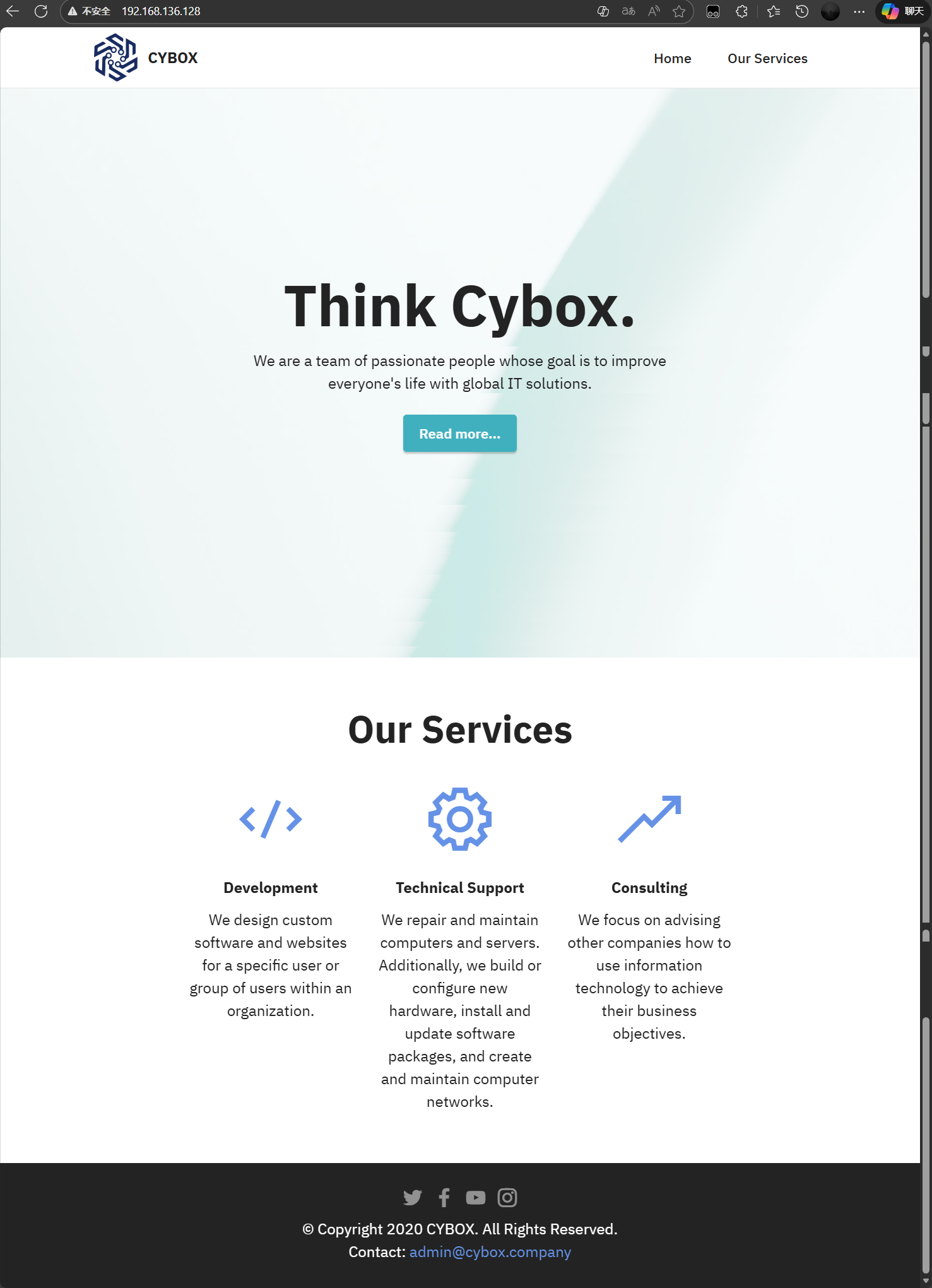 除了admin@cybox.company 邮箱地址外没有啥线索了,使用dirb 工具常规爆破一下网站目录看看,控制台输入