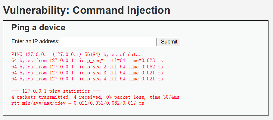 这是一个通过输入IP地址测试通信状况的网页,后台执行的是 'ping' 命令。但是有操作系统的判断,所以需要通过回显判断对方服务器使用的是什么系统。先在输入框中输入IP地址:127.0.0.1