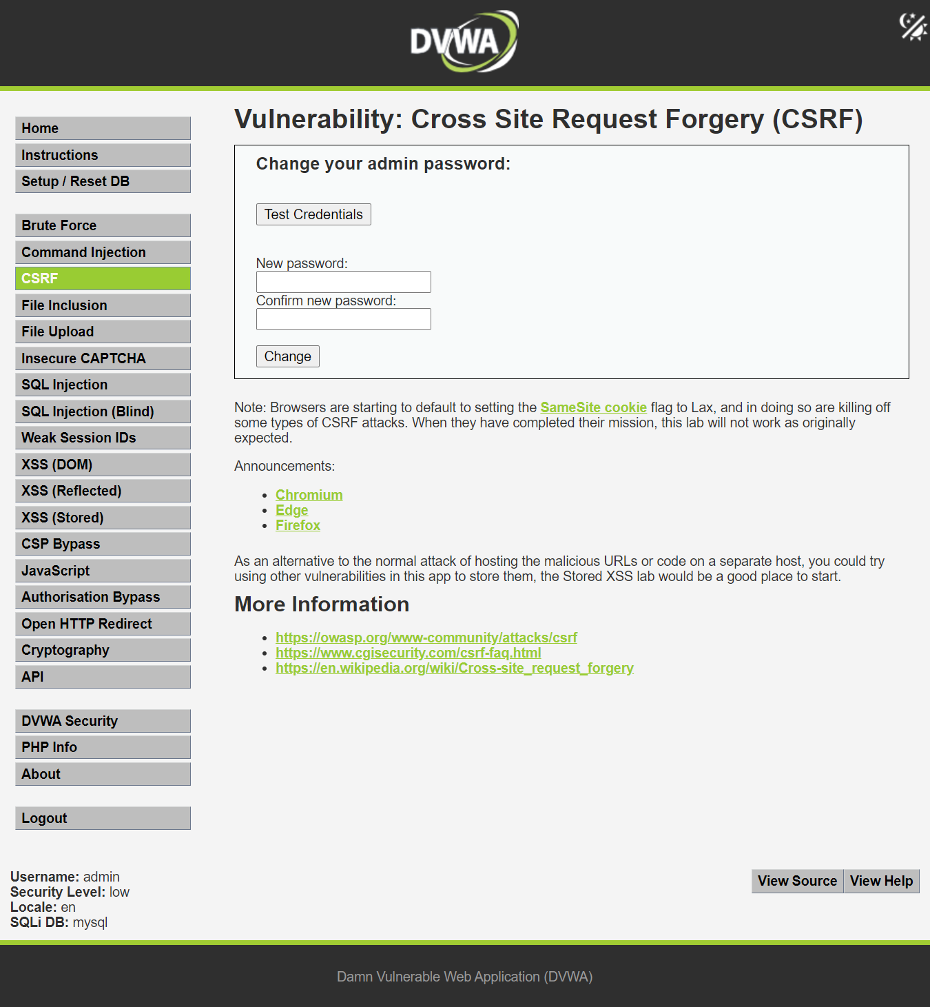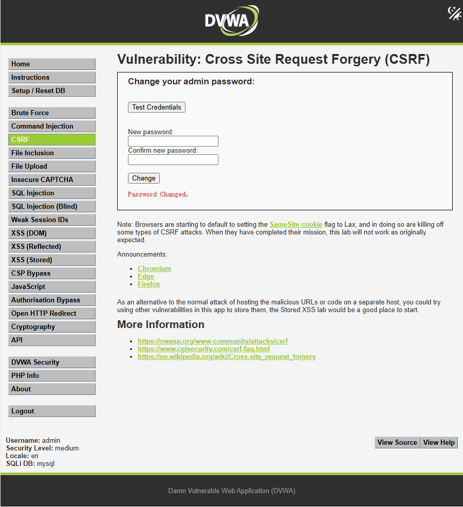 Vulnerability: Cross Site Request Forgery (CSRF)(跨站请求伪造)
