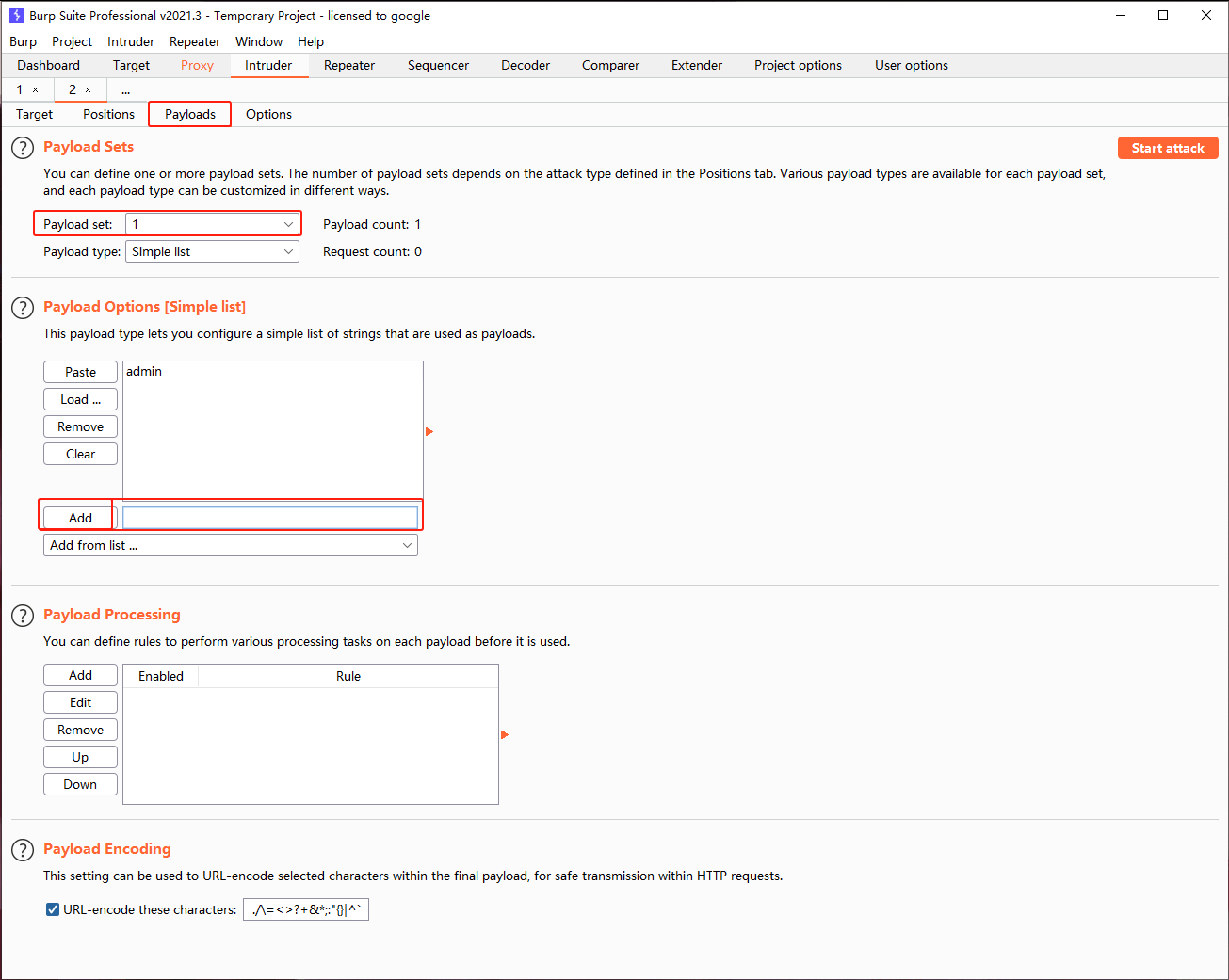 点击Payloads,Payload set这里的1就是之前选的用户名,在下方的Payload Options [simple list] 中的输入框中输入admin 然后点击Add
