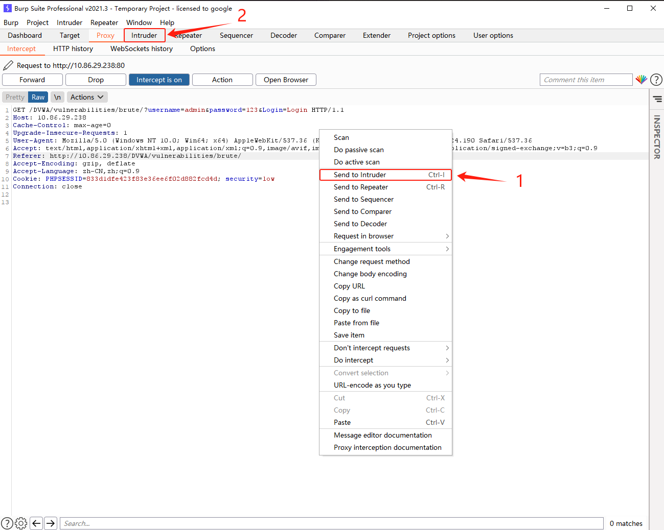 右键选择 Send to Intruder ,然后将 Intercept is 设置为 off,接着点击 Intruder