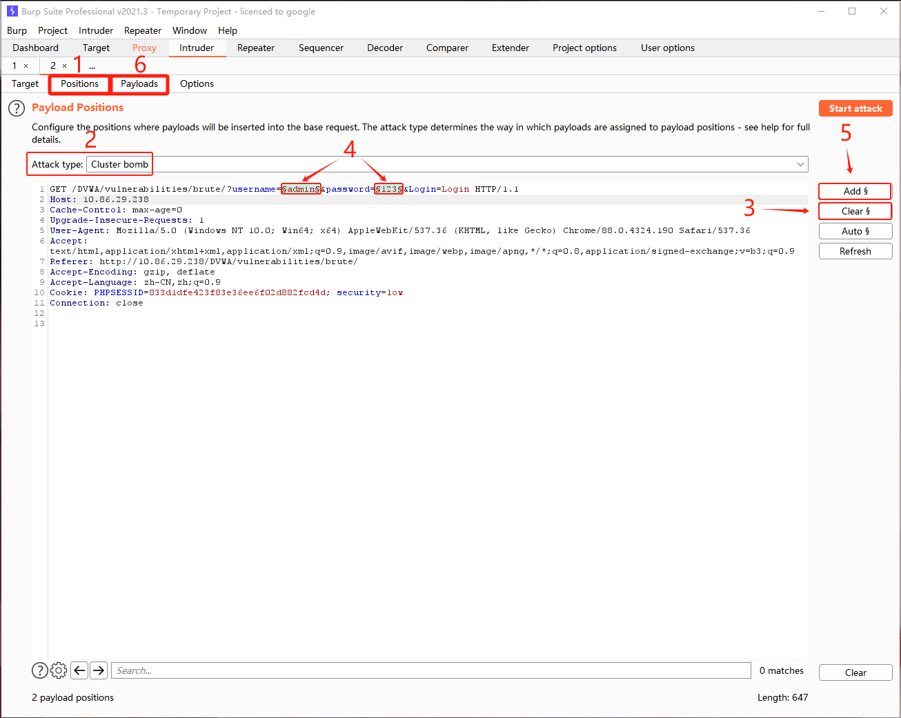 在第一行中GET /DVWA/vulnerabilities/brute/?username=admin&password=123&Login=Login HTTP/1.1选中username中的admin接着点击add,password中的123 也是一样。