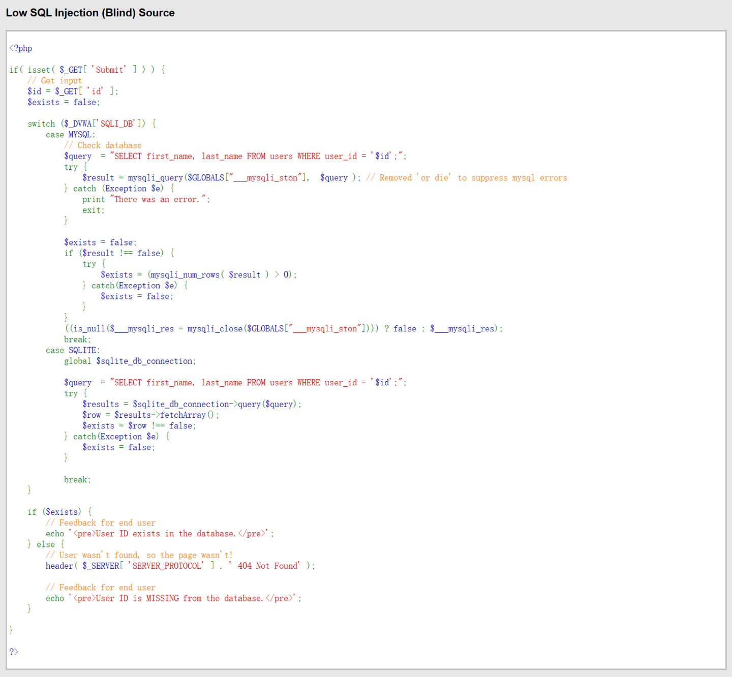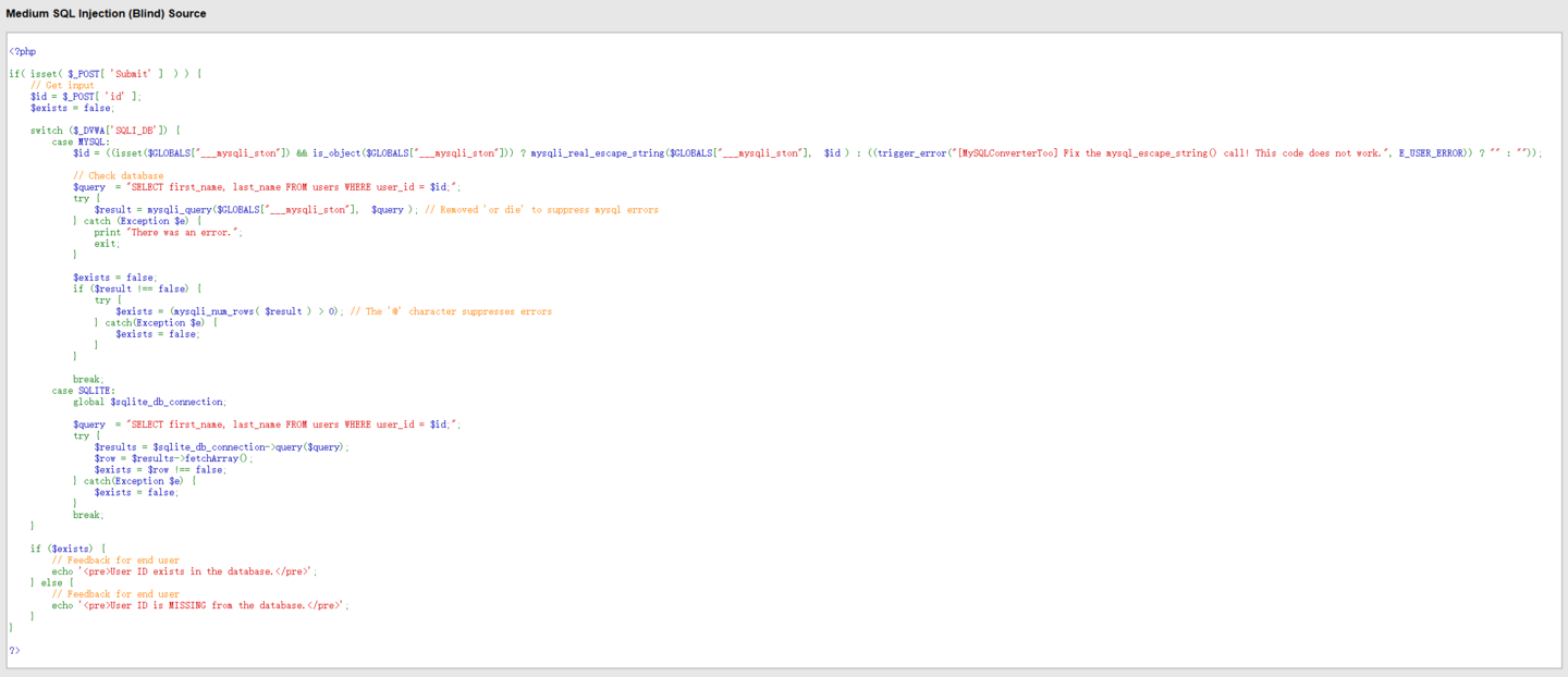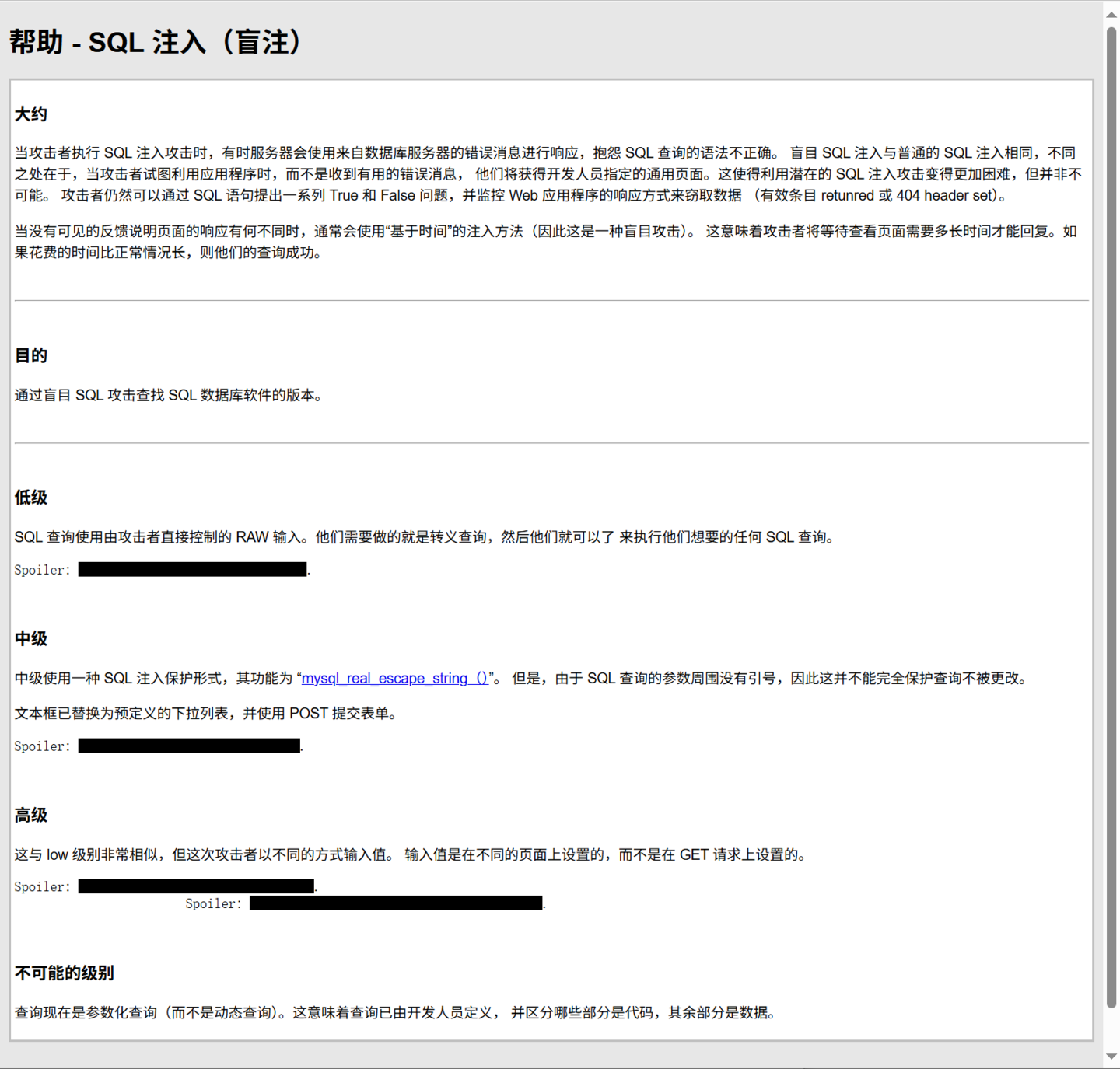 后面的High和上题同样的,注入都是同样的手法,只不过盲注耗时耗力,如果没什么价值就不值得黑客这么做,但作为安全专家需要进行渗透测试确保系统无漏洞,即便无价值也有可能挖掘出更深的漏洞,不容忽视,只是教学这里我懒得再赘述了。