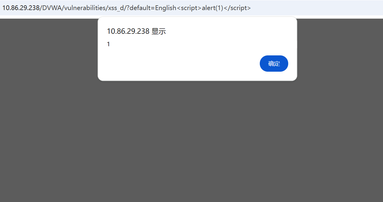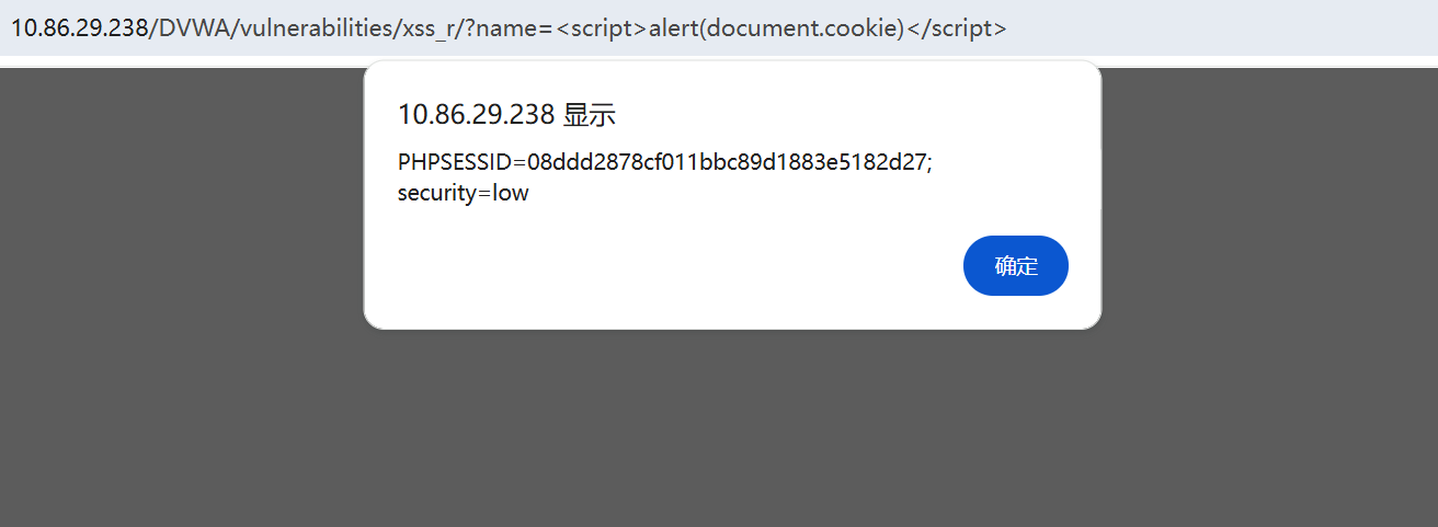 http://10.86.29.238/DVWA/vulnerabilities/xss_r/?name=<script>alert(document.cookie)</script>验证成功
