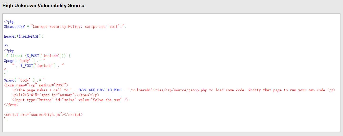 这里定义了一个变量 headerCSP 并放置了一些 url,使script src指令指向一个外部 JavaScript 文件header() 函数以原始形式将 HTTP 标头发送到客户端或浏览器。