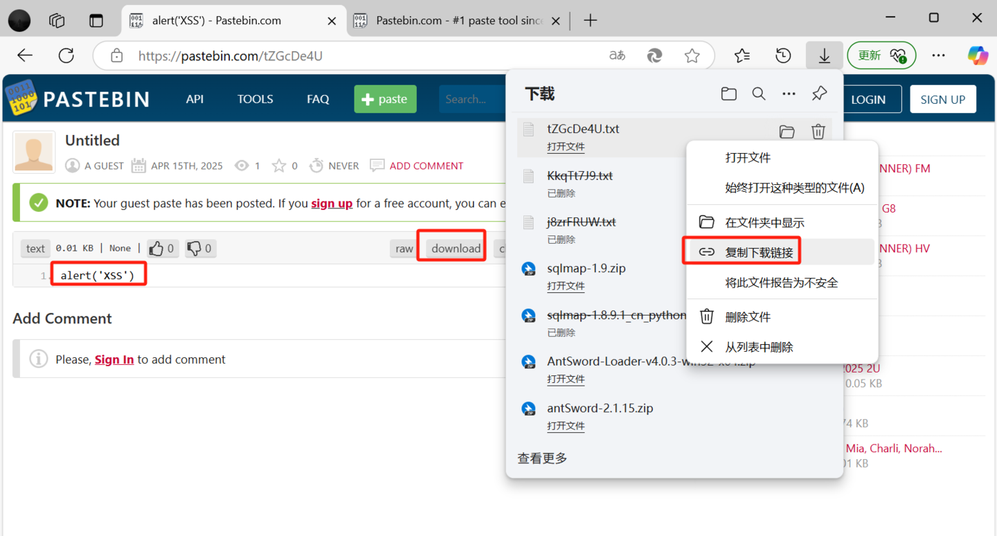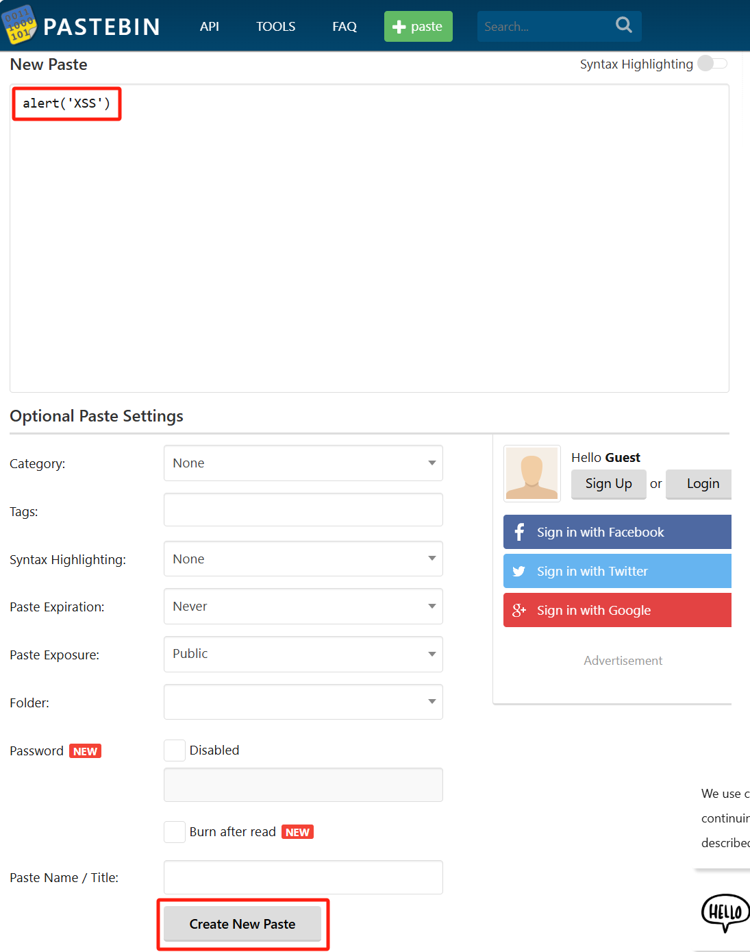 在New Paste中输alert('XSS'):