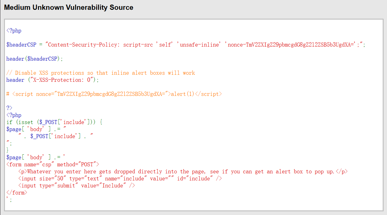 <script nonce="TmV2ZXIgZ29pbmcgdG8gZ2l2ZSB5b3UgdXA=">alert(1)</script>High: