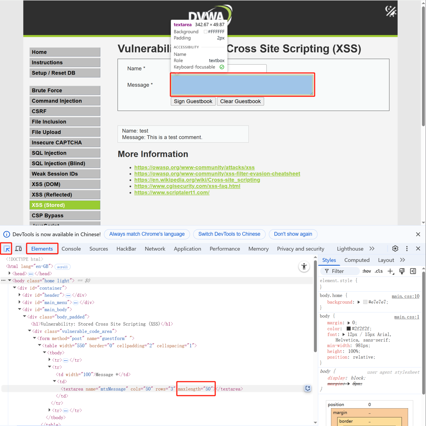 这里会遇到个问题,长度不够。我们可以在控制台中元素页,使用检查,选中评论区,将maxlength的值修改为150,反正只要塞得下你的恶意代码就行