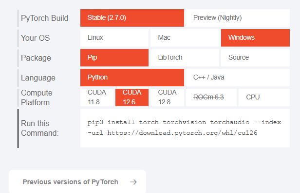 pip3 install torch torchvision torchaudio --index-url https://download.pytorch.org/whl/cu126这里的GPU所需的cu版本需要自行检查,看自己的显卡是否支持此版本