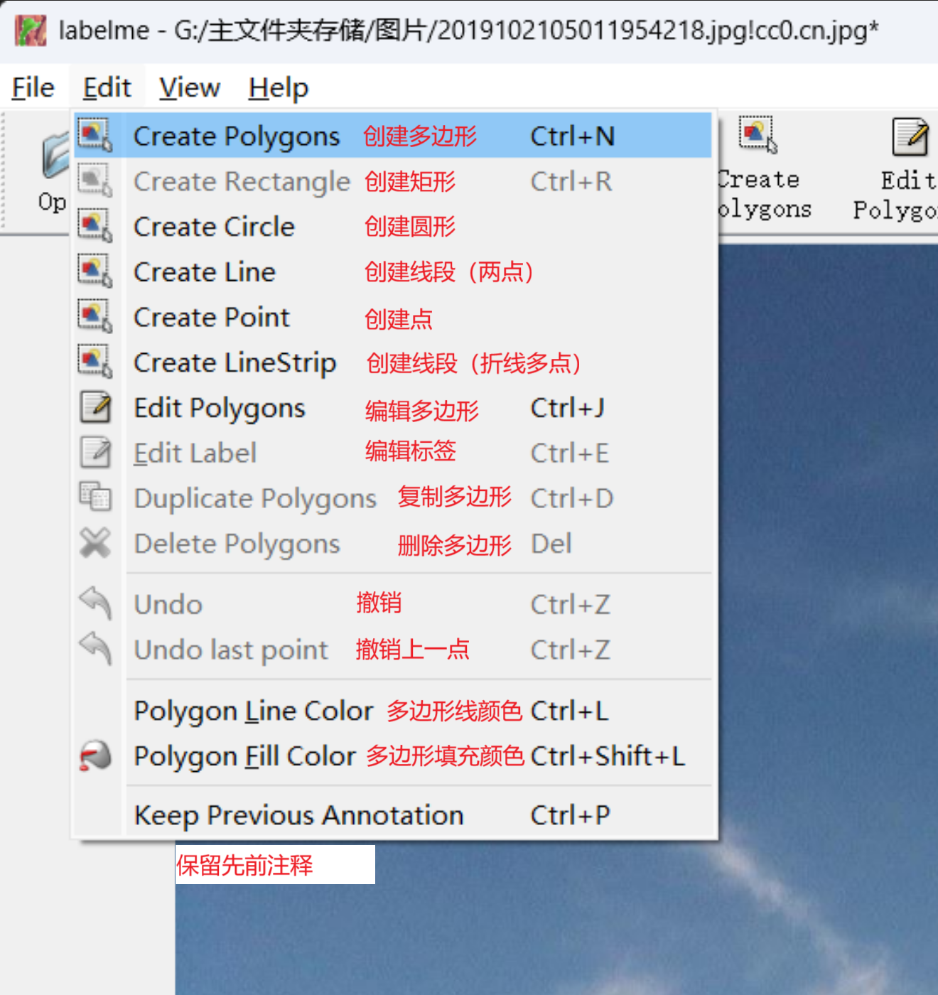 标注完之后点击 save 进行保存,注意:最好把标注完的json文件与原图存放在一个目录下,这样在后期查看的时候可以看到原图与标注区域的叠加,而不单单是原图。