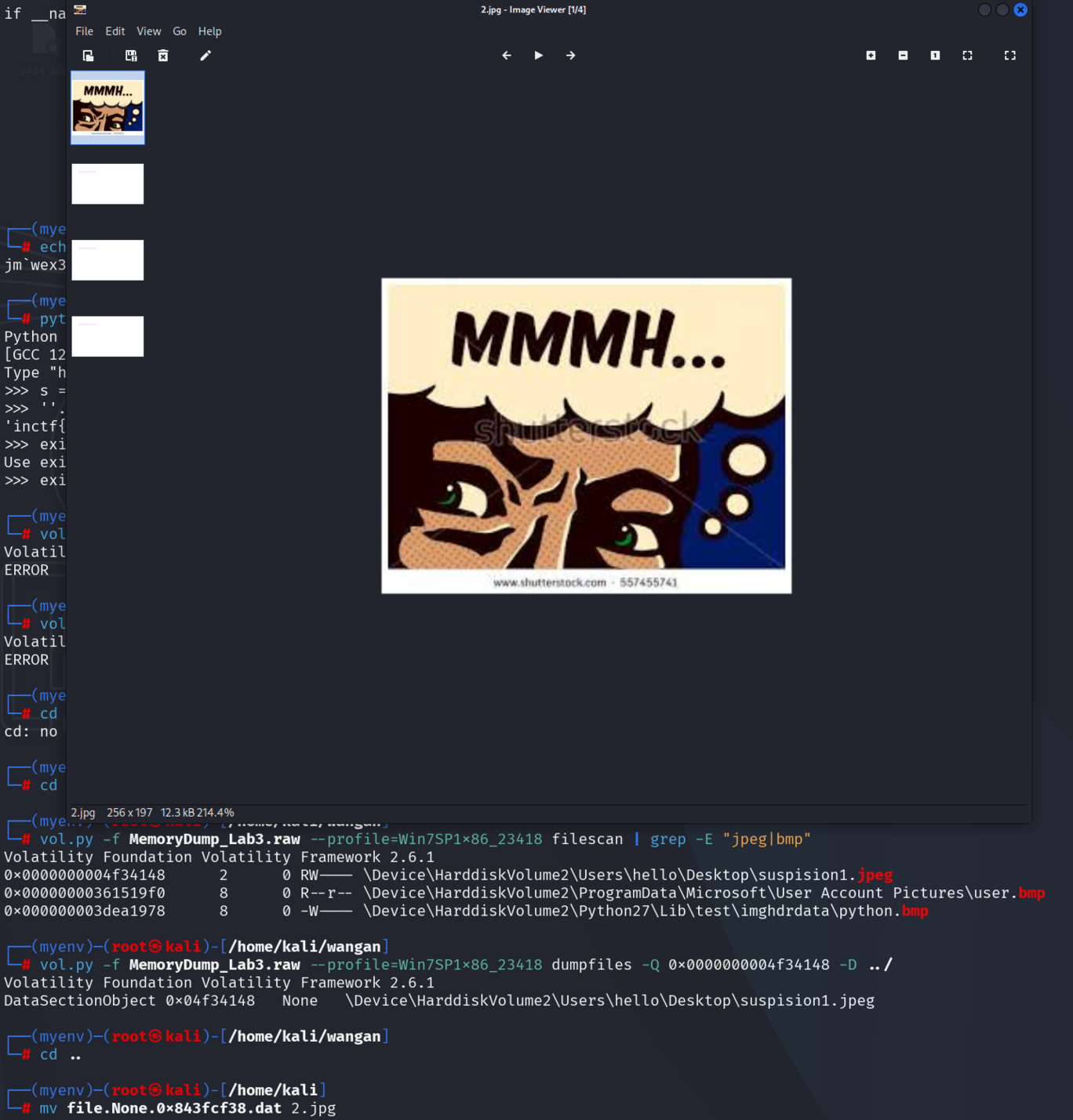 vol.py -f MemoryDump_Lab3.raw --profile=Win7SP1x86_23418 filescan |grep -E "jpeg|bmp"