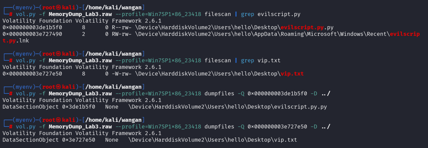 vol.py -f MemoryDump_Lab3.raw --profile=Win7SP1x86_23418 filescan | grep evilscript.py