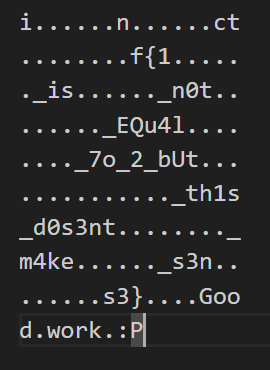 我们就得到了inctf{1_is_n0t_EQu4l_7o_2_bUt_th1s_d0s3nt_m4ke_s3ns3}Goodwork:P