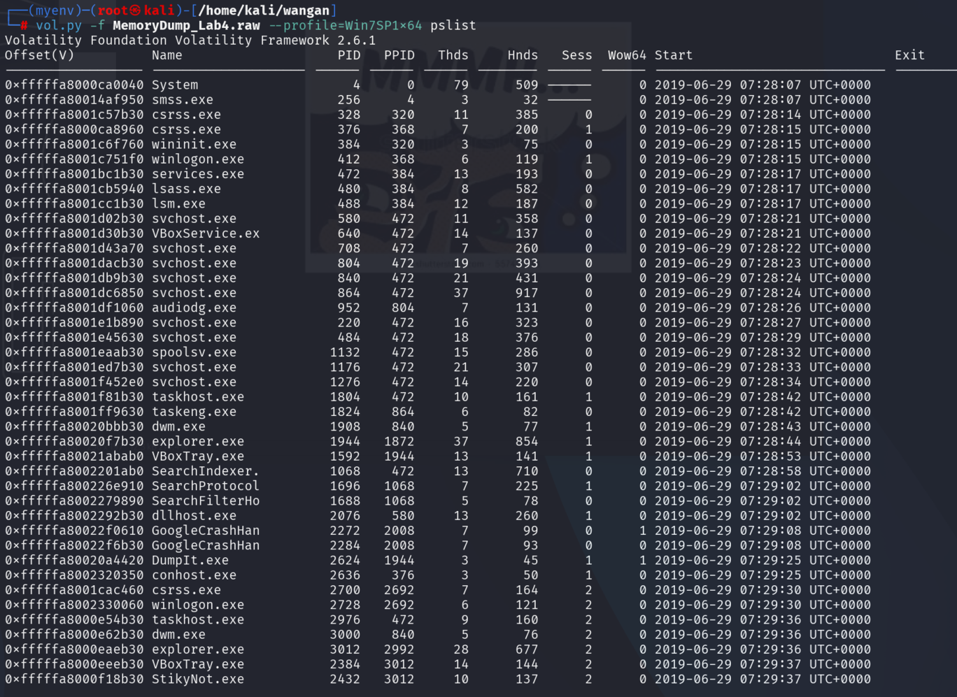 vol.py -f MemoryDump_Lab4.raw --profile=Win7SP1x64 pslis