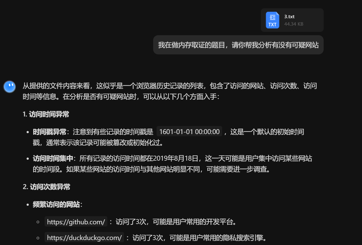 vol.py --plugins=../volatility/volatility/plugins -f MemoryDump_Lab6.raw --profile=Win7SP1x64 chromehistory > 1.txt历史记录太多太长,我这里丢给AI分析可疑网站了: